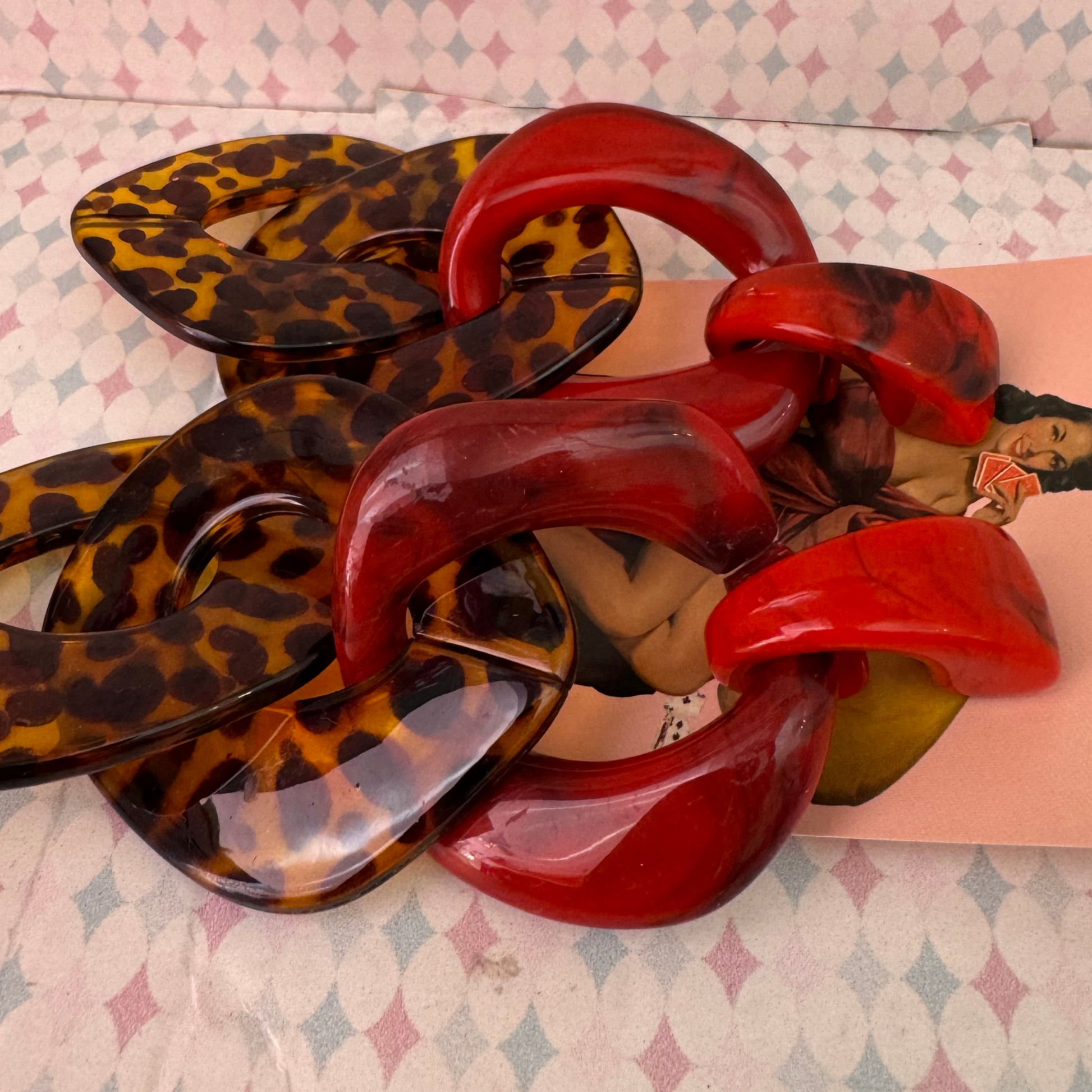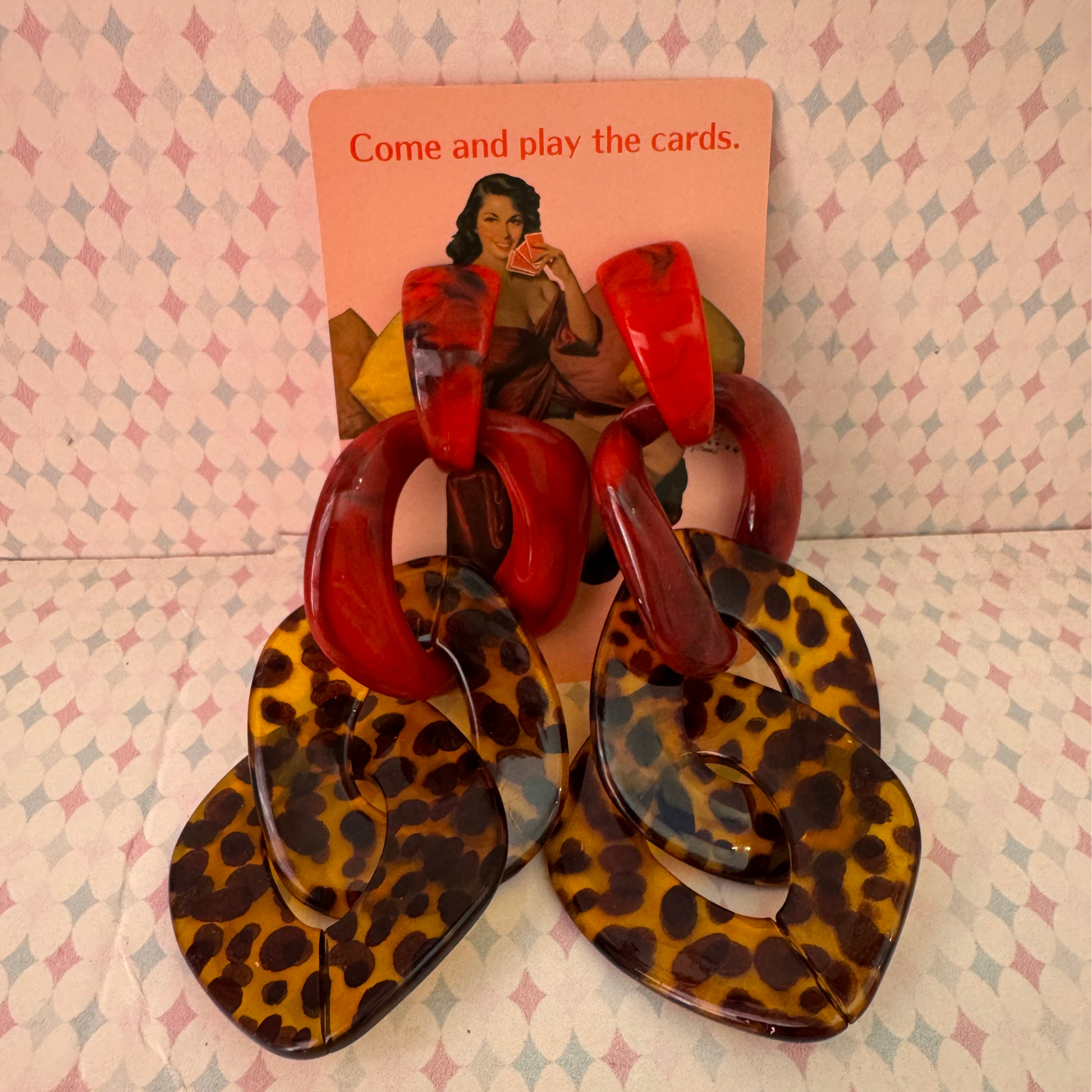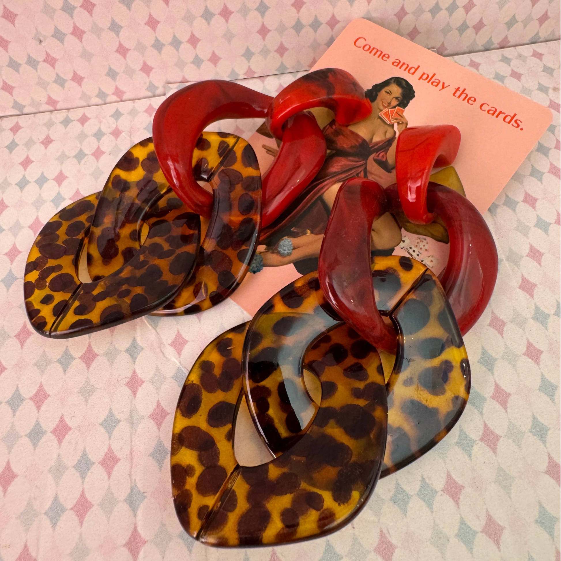 Make a statement with these rockabilly rebel oversize earrings. Marbled red top with leopard print. Light and comfortable to wear, with no compromise on maximum accessorising. Perfect for your vintage, pin up or modern look.