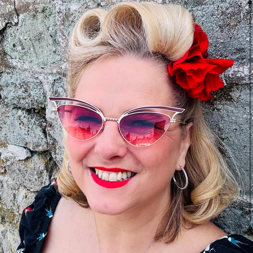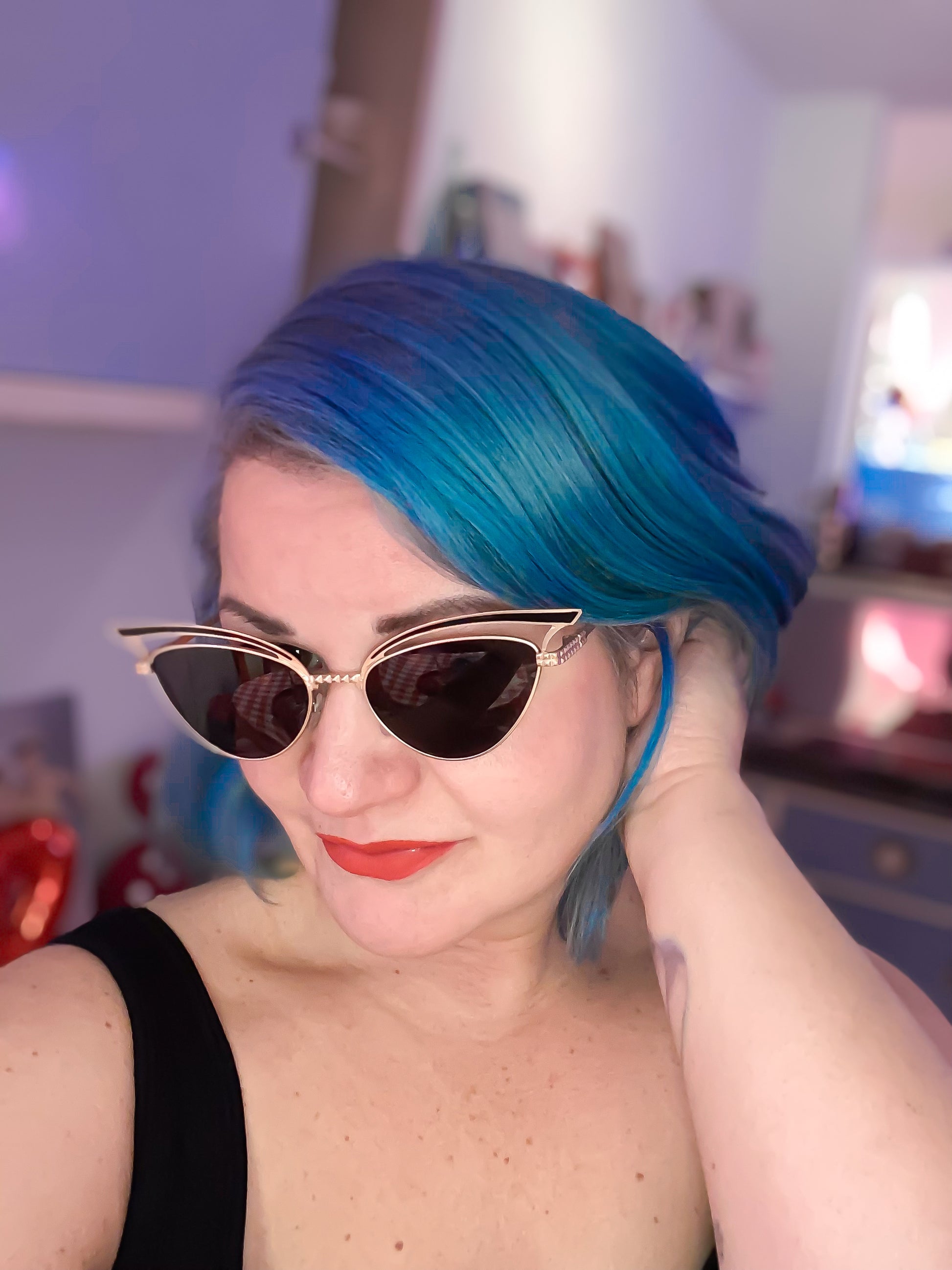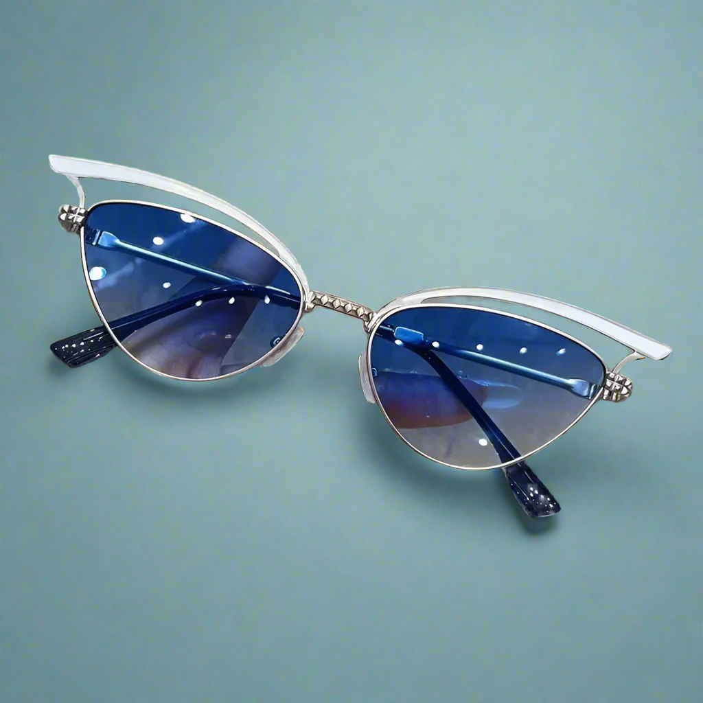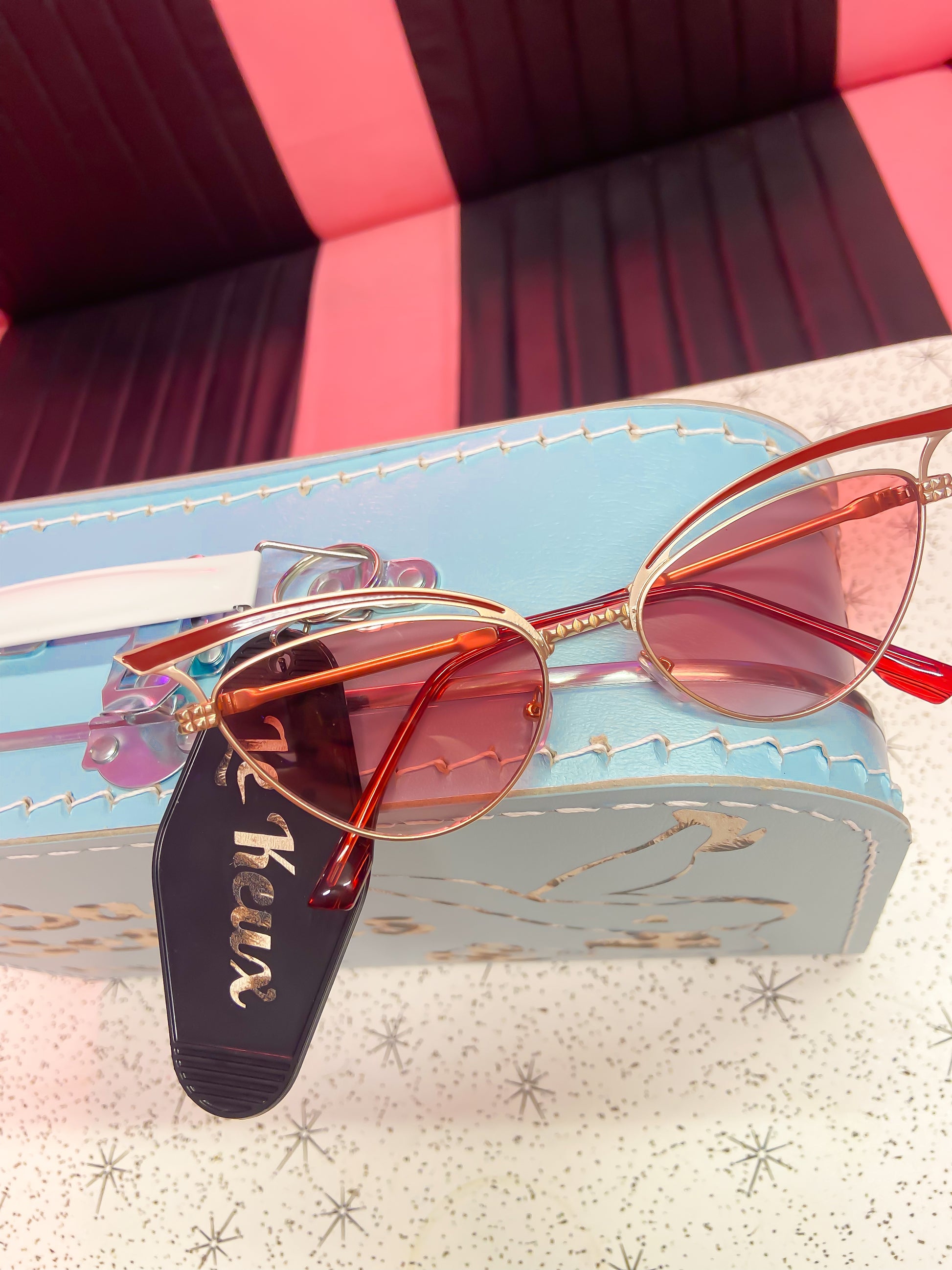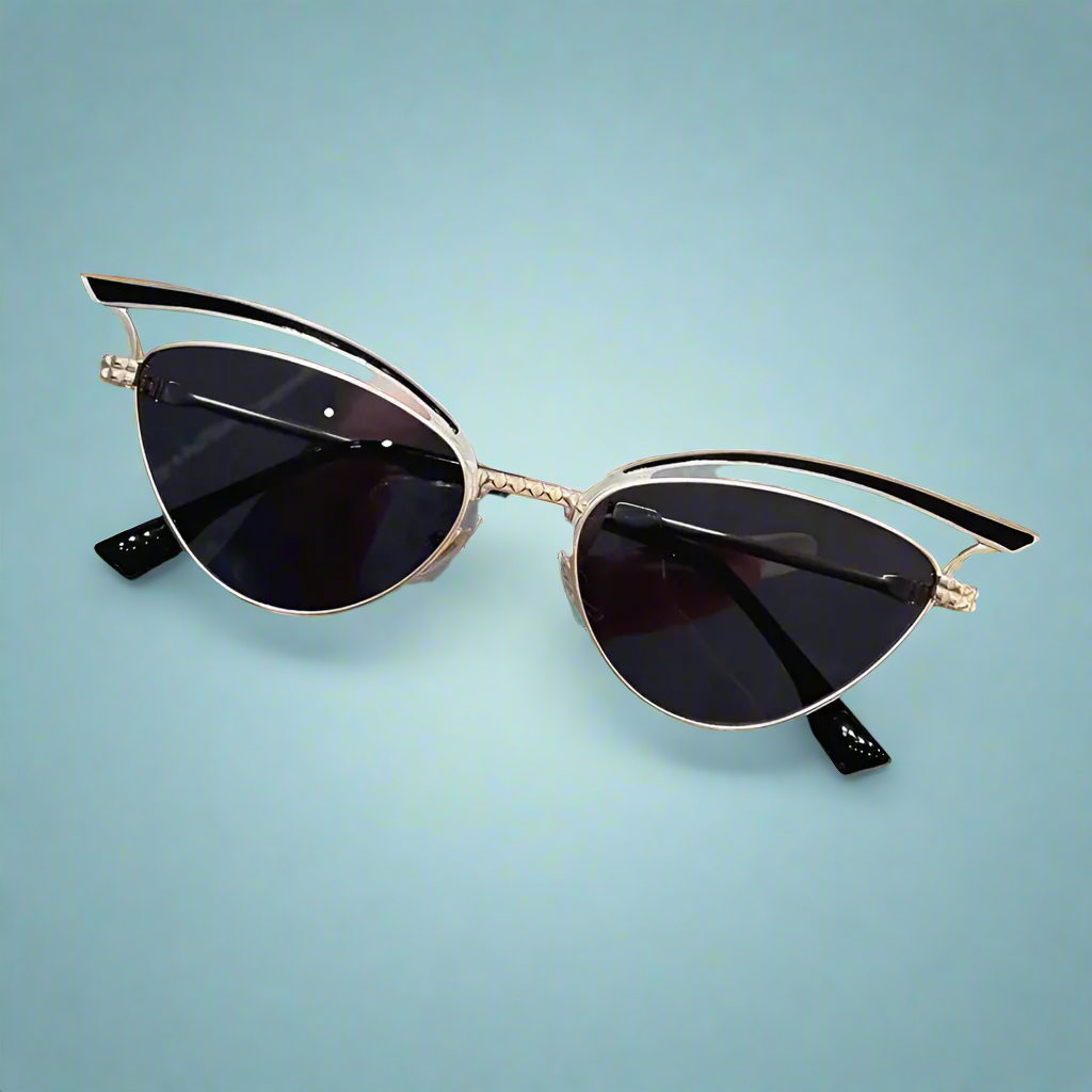 Rock a vintage look with these metal pin-up sunglasses featuring a bold, double exaggerated cateye frame. Available with lenses in blue, red, or black for a fun splash of colour.