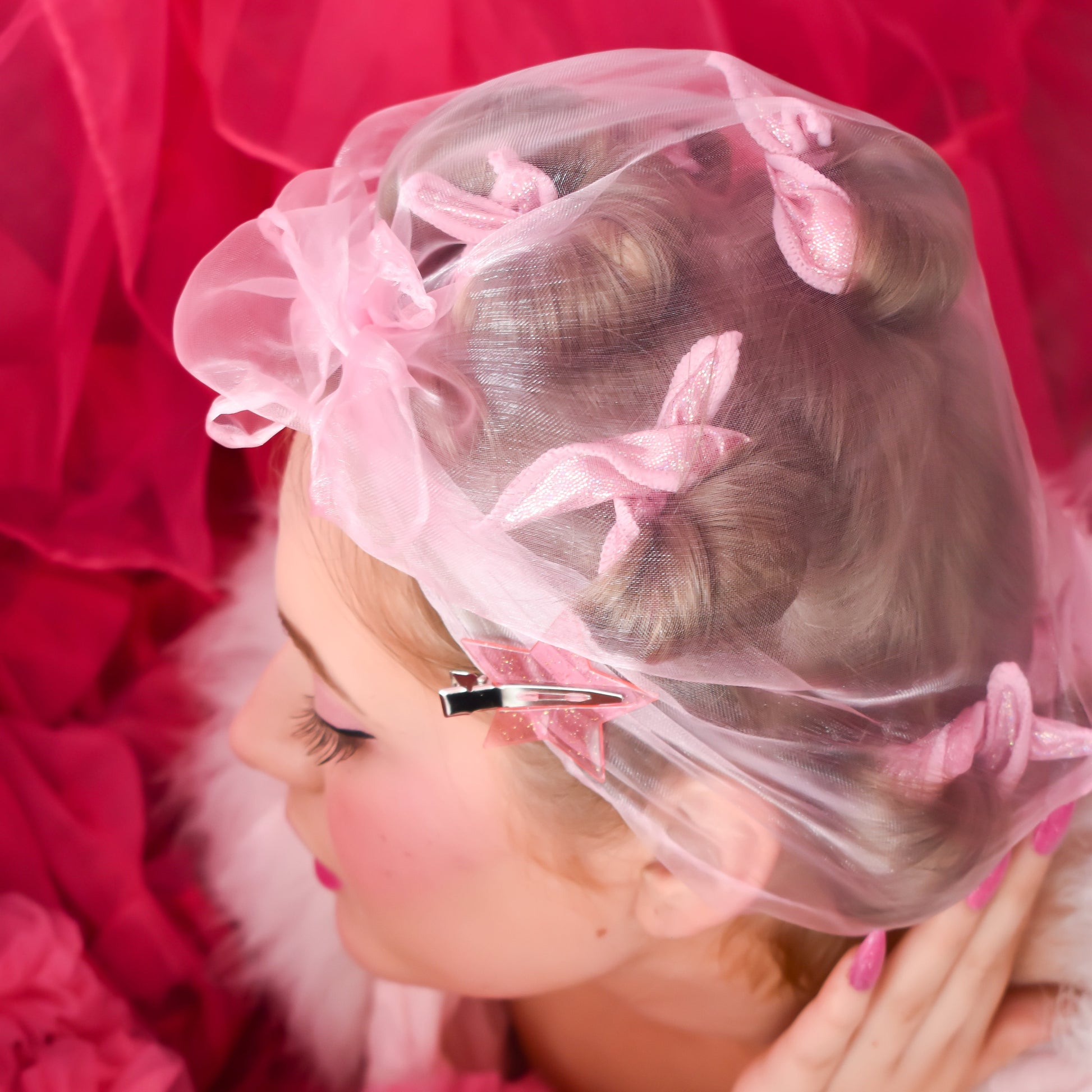 Let your pin curls set in this adorable square veil headscarf! Complete with glitter snap clips to keep it from slipping on your head.
