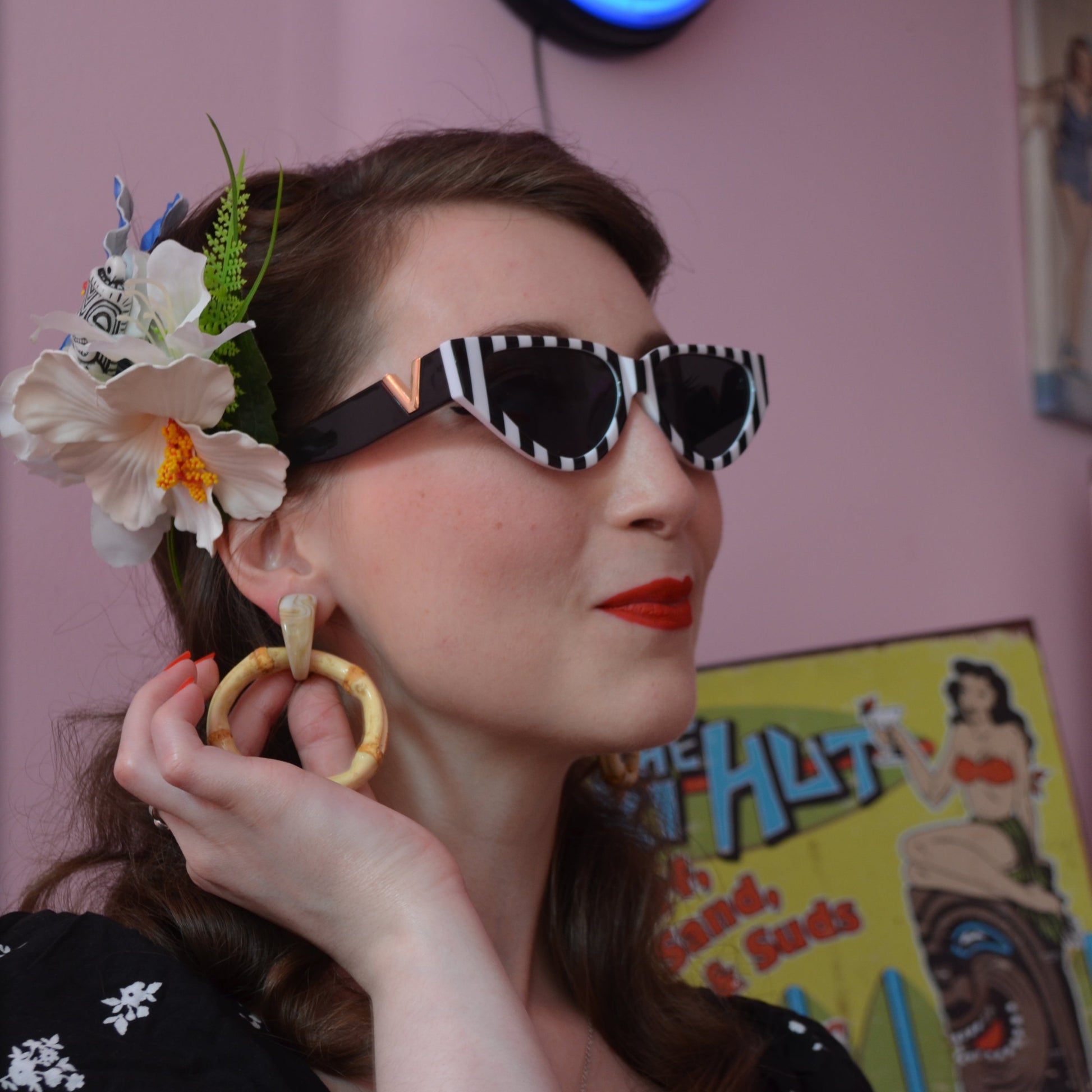 Step out in style with these black and white striped sunglasses, perfect for nailing that playful rockabilly 50s vibe.